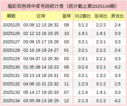 红球三区比3:1:2,质合比为4:2,012路比为2:1:3,蓝球为合数、0路号码。