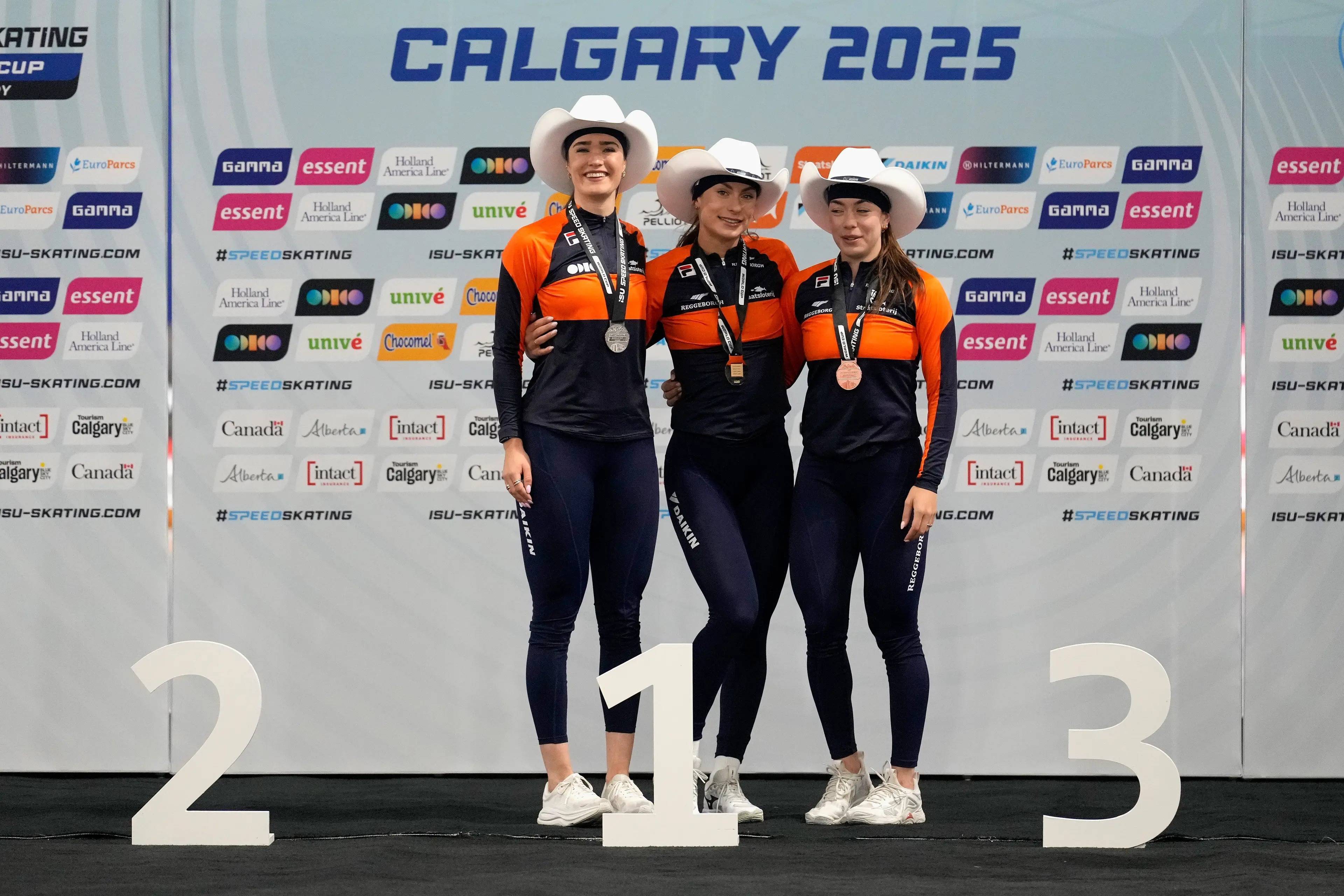费姆克·科克(中)、伊莎贝尔·格雷弗尔特(左)与玛丽特·弗莱德勒斯在女子1000米受奖庆典上。图源:海外溜冰连合会官网在女子3000米和须眉5000米比赛中,荷兰选手乔伊·伯纳和来自好意思国的凯西·说念森区别以3分54秒42和6分01秒84的收获夺冠,说念森的收获也刷新了场馆记录。