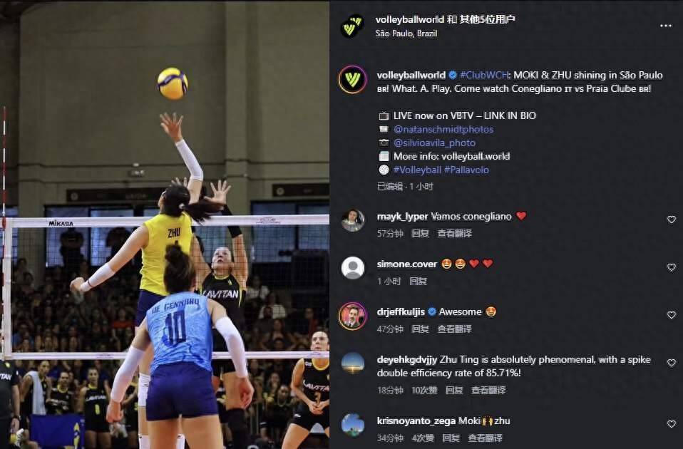 朱婷再次打出统领级数据!海外排联发文盛赞,深受巴西球迷风趣